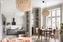 Vardagsrumsdelen erbjuder plats för både soffgrupp och matplats i naturlig anslutning till köket. Generöst ljusinsläpp från fönster mot innergården förstärker den luftiga känslan och det genomgående brädgolvet ramar in rummet med värme och karaktär. Kök och vardagsrum samspelar i öppen planlösning med en social bardel och naturlig plats för matgrupp intill, där umgänge och samtal kan flöda fritt.
