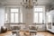 Från entrén når vi det rymliga och påkostade köket som är förenat med en matplats som rymmer många middagsgäster. Känslan är genomgående exklusiv med carraramarmor som huvudkomponent på såväl arbetsbänkar som köksö. Interiören går helt i tidstroget utförande med vita profilerade luckor och tidsenliga beslag. Här har man verkligen dragit nytta av den generösa takhöjden och låtit skåpen gå hela vägen upp till det vackra taket med stuckaturer. Köket är det mellersta rummet av tre i fil med sällskapsrummet på ena sidan och sovrummet på andra. På golvet ligger fiskbensparkett och de stora fönsterna vetter mot parkens grönska. Köket är även utrustat med diskmaskin, kyl/frys, mikrovågsugn och ugn från Smeg.