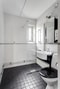 Sort och helkaklat badrum som är utrustat med toalett, handfat, dusch och badrumsskåp.