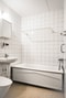 Kaklat badrum med wc, handfat, spegel, badkar och vinyl på golvet.