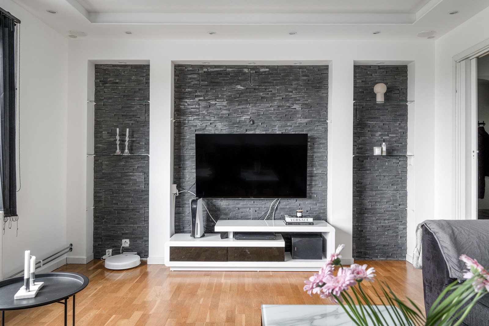 På golvet vilar parkett och väggarna är målade i vitt. Här finns plats för både stor soffgrupp och matgrupp. De stora fönsterna bidrar till ett fantastiskt ljusinsläpp. Vacker utsikt från nionde våningen.