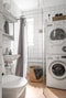Välskött badrum med väggar kaklade i vitt och våtrumsmatta på golvet. Här finns wc, dusch, vask och spegelskåp, tvättmaskin samt torktumlare.