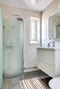 Stilrent badrum med klinker på golv och kakelklädda väggar med inslag av marmor. Utrustat med toalett, vask, kommod, dusch och glasdörrar.