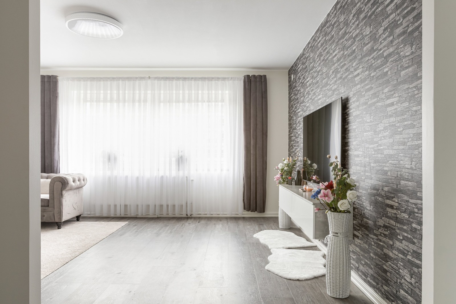 Laminat på golv och likt hallen är väggarna målade i ljusa färger samt tapetserad fondvägg. Ger plats för soffgruppen och annan möblering efter tycke och smak.