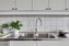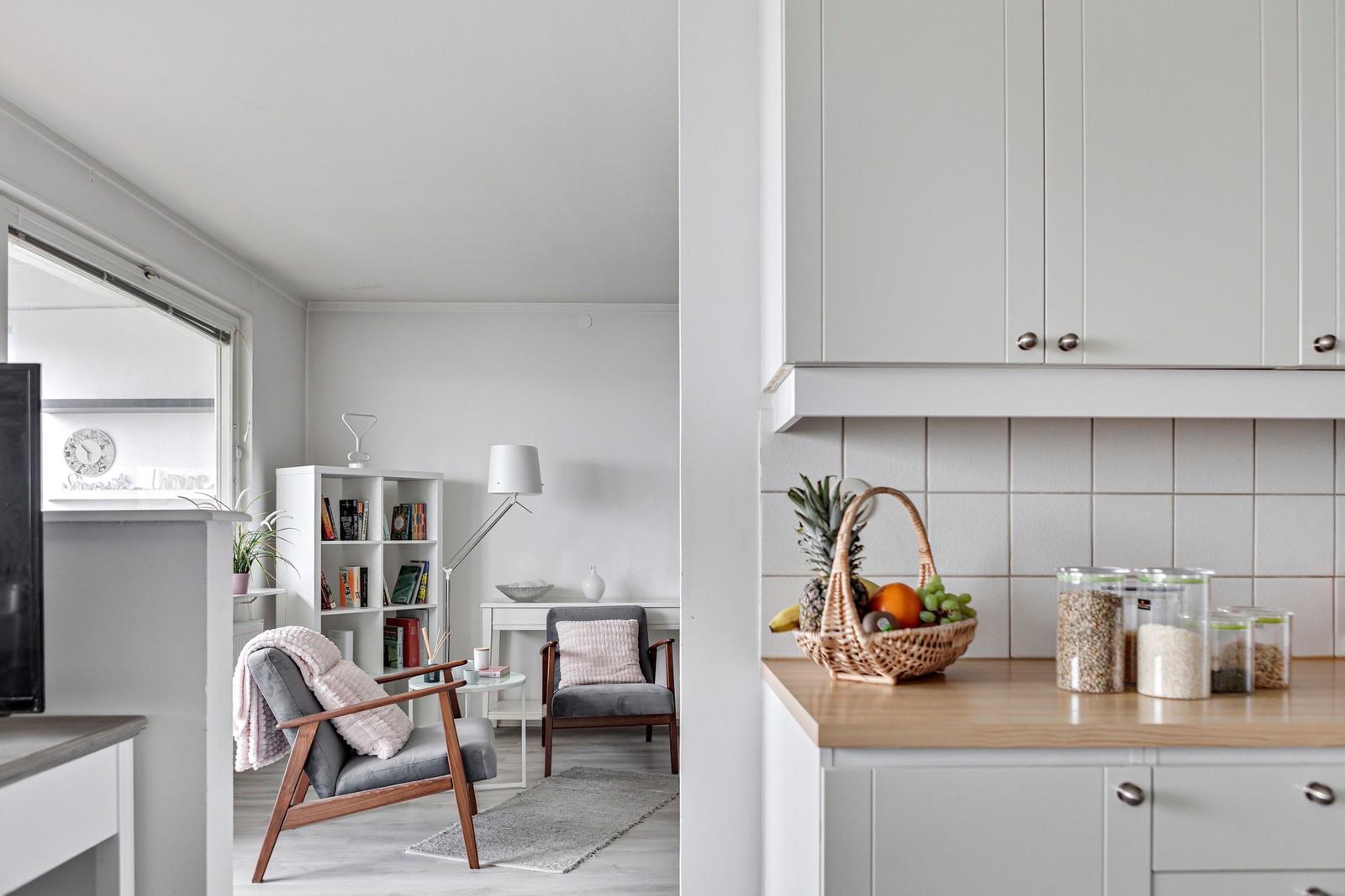Trivsamt kök med samma genomgående ljusgrå golv och vita väggar som i övriga bostaden. Vita skåpsluckor kombineras snyggt med slitstark diskbänk i rostfritt stål och arbetsyta i laminat. Köket är utrustat med spis, ugn, fläkt, vask, diskmaskin samt kyl och frys. Här ryms också en matplats för cirka fyra personer – perfekt för både vardagsmiddagar och helgens långa frukostar.