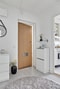 Välkomnande hall med ljusgrått golv och vita väggar som skapar en stilren första känsla. Här finns goda avhängningsmöjligheter samt naturlig access till bostadens samtliga rum.