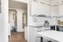 Köket går i en ljus och modern stil där mörkt klinkergolv möter vita väggar och ett klassiskt liggande kakel som stänkskydd. De vita köksluckorna och den ljusa bänkskivan med rostfri kant ger ett tidlöst intryck, och här finns gott om funktion i form av diskmaskin från Cylinda, kolfilterfläkt, kyl och frys samt ugn och mikro från Ikea. Vinkylen och induktionshällen från Schott Ceran sätter en extra prägel, och det högre bordet blir en naturlig plats för både vardag och umgänge.