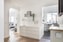 Vardagsrummet nås via ett mjukt valv och präglas av fiskbensparkett och vita väggar. Det stora fönsterpartiet släpper in fint ljus och ger rummet en luftig och inbjudande känsla.