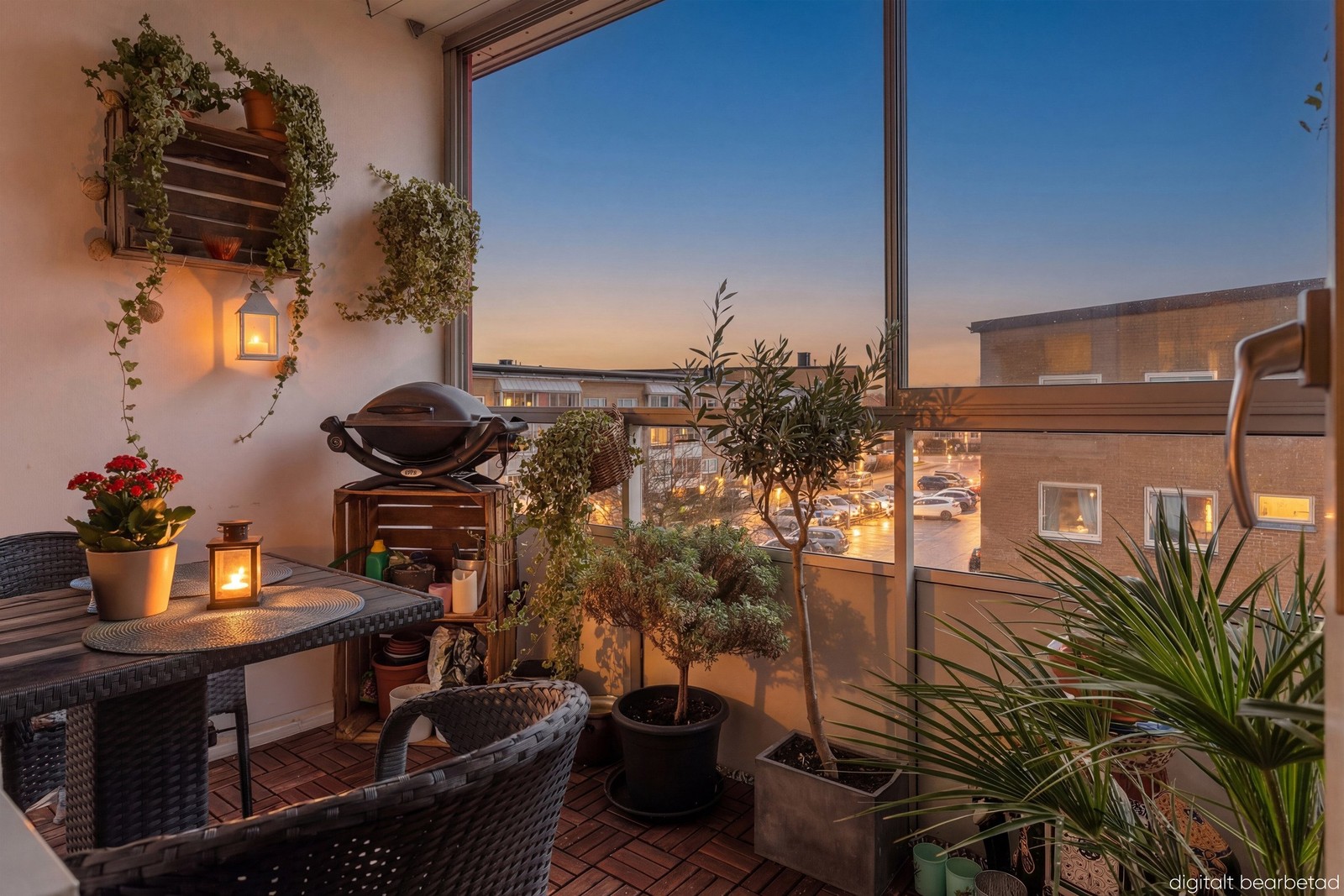 Den inglasade balkongen i soligt söderläge blir snabbt en favoritplats och fungerar som ett extra rum stora delar av året – idealiskt för avkoppling eller umgänge.