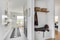 Du möts av en välkomnande hall med ljusgrått klinkergolv och vitmålade väggar som skapar en stilren och ljus känsla. Här finns plats för avhängning av kläder samt gott om förvaring i garderober – både praktiskt och elegant.