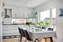 Köket är ljust och smakfullt med vit inredning från Marbodal, grafitgrå laminatbänkskiva och vitt kakel ovanför diskbänken. Full maskinell utrustning ingår: induktionshäll från Electrolux (2008), ugn med värmefunktion från IKEA (2005), kyl och frys från Siemens (2008), spisfläkt från Franke (2008) samt diskmaskin från Siemens (2008).