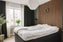Härligt sovrum med likadan ekparkett som resterande rum samt vitmålade väggar bortsett från ena väggen som är målad i en grön ton. Denna vägg har också akustikpanel i mörkt trä. Förvaring erbjuds i en skjutdörrsgarderob.