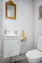 Badrummet, renoverat 2015, är smakfullt inrett med vitt kakel i omlott och ett stilrent grafitgrått klinkergolv. Här finns dusch, vägghängd wc, handfat samt både tvättmaskin och torktumlare med praktisk arbetsbänk och förvaring ovan. Även gästtoaletten renoverades samma år i matchande stil, vilket ger ett enhetligt och genomtänkt helhetsintryck.
