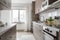 Modernt och funktionellt kök med grå/beige köksluckor, vit bänkskiva och vitt kakel ovanför arbetsytorna. Här finns generöst med förvaring i skåp som går upp till tak samt plats för matbord. Köket är utrustat med diskmaskin, ugn, mikro, fläkt, spishäll samt kyl och frys. Laminatgolv och vita väggar.
