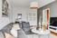Rymligt och lättmöblerat vardagsrum med vacker ekparkett och väggar i ljusgrått, kompletterat med en diskret tapet i samma ton. Stora fönsterpartier ger fint ljusinsläpp och leder ut till balkongen som rymmer ett mindre möblemang.