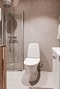 Exklusiv känsla med stora kakelplattor i sandfärgad ton. Här finns det även kombinerad tork och tvättmaskin. Bra förvaringsmöjligheter och badrummet känns luftigt med glasväggar som går att vika in. Vita och kromade detaljer och tvättställ med kommod samt handdukstork och en super fin unidrain brunn. Renoverat med kvalitetsintyg och behaglig golvvärme.