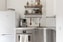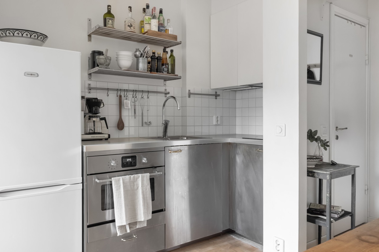 Modernt kök med köksluckor i vitt och rostfritt, bänkskiva i laminat och vitt kakel som stänkskydd. Vitpigmenterat parkettgolv och ljusa väggar. Köket är utrustat med kyl/frys, glaskeramikhäll, integrerad fläkt och ugn.