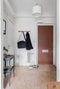 Säkerhetsdörren välkomnar på bästa sätt. Parkettgolv, ljusa väggar och plats för avhängning.