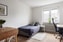 Vitpigmenterat parkettgolv och ljusa väggar. Plats för säng samt soffa och matbord i anslutning till köket.