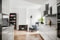 På höger sida av hallen finner du köket som förenas med vardagsrummet i en social, öppen planlösning. Köksinredningen består av vita köksluckor och brunt kakel ovanför bänkskivan i vit laminat. Köket är utrustat med spishäll, inbyggnadsugn med varmluftsfunktion, inbyggnadsmicro, kolfilterfläkt, diskmaskin, kyl och frys med ismaskin. Kökstaket pryds av infällda spotlights.