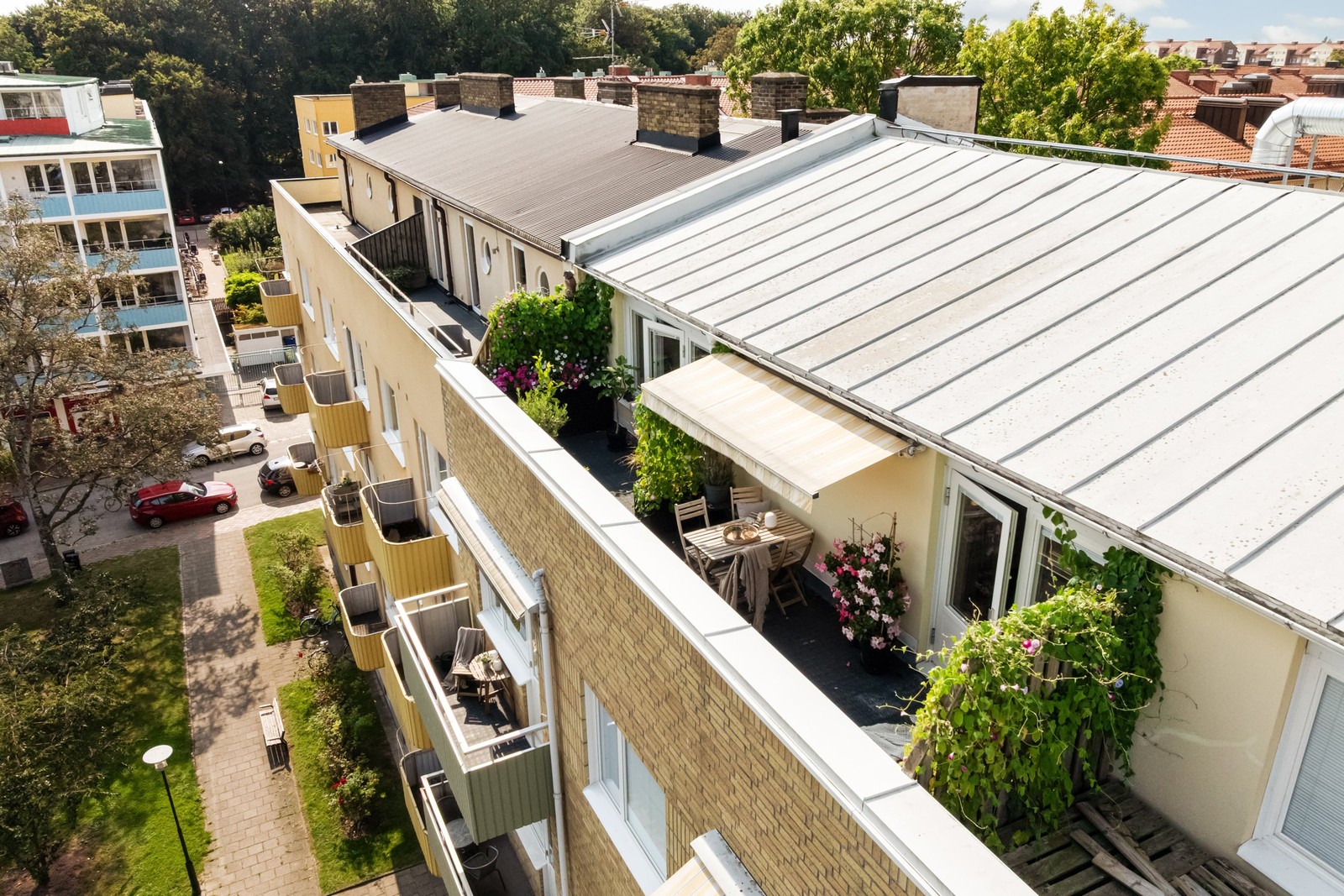De tre gatorna Köpenhamnsvägen, Mariedalsvägen och Regementsgatan är huvudgatorna i området och här finns många mysiga specialbutiker som blomsteraffärer men också caféer och restauranger. I Slottsstaden finns mängder med grönområden, all tänkbar service och goda kommunikationsmöjligheter med innerstadsbussar och cykelvägar. För den som vill går det också att promenera in till city eller Pildammsparken på bara några minuter.