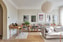Genom ett djupt valv från matsalen träder du vidare in mot vardagsrummet. Även här flyter den fiskbensmönstrade parketten tröskellöst vidare. Ljuset strömmar fritt in genom två höga fönsterpartier och väggarna är målade i en harmonisk beige ton. Vacker stuckarur och takrosett med botaniska motiv pryder det vitmålade taket.
