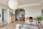 Fiskbensparketten löper vidare in i matsalen som är ett uppskattat extrarum för att kunna duka upp till många på. Här är väggarna strukna i en varmt beige ton och det vitmålade taket pryds av en takrosett. Ett praktiskt förvaringsutrymme finns som en nisch i rummet som döljs bakom ett draperi.