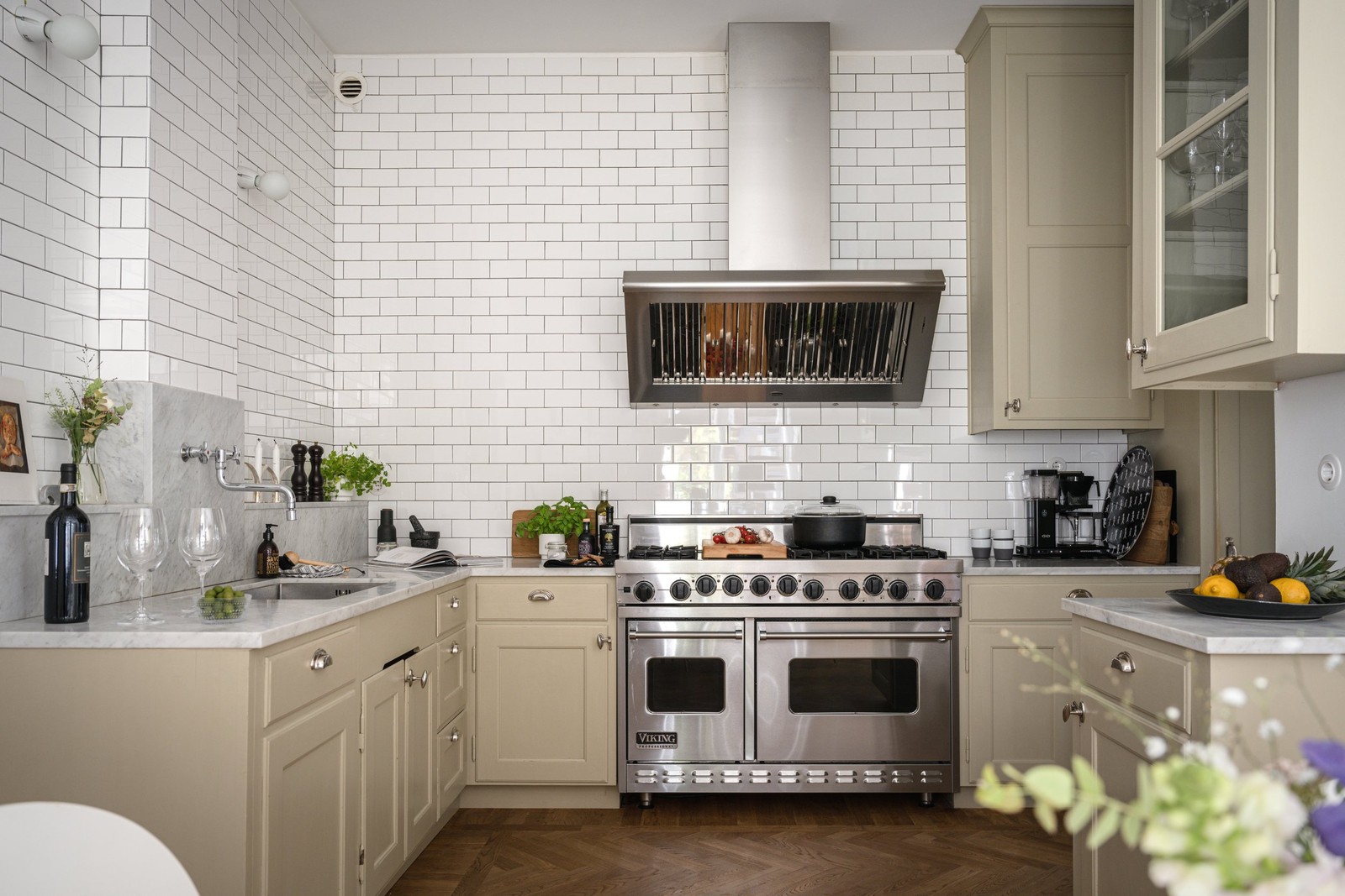 Tvättäkta matlagningsglädje och en dröm för byggnadsvårdsentusiasten bjuder det platsbyggda snickeriköket från Byggfabriken på. De gedigna luckorna av massivt trä i en ljus gröngrå ton och tidstrogna profiler matchar ursprunget oklanderligt, vilket är påtagligt när du betraktar originalskåpet som finns bevarat på ena väggen. Arbetsbänkarna pryds av tidlös carrarmarmor och väggarna ovan är klädda med metrokakel i halvförbandssättning. Skåpen erbjuder ett makalöst utrymme, i synnerhet överskåpen som går hela vägen upp till taket och har extra djup. Maskinerna, liksom köket i sin helhet är synnerligen påkostade och består bland annat av en gasspis med 6 plattor och dubbla ugnar från Viking samt en rejäl fläkt. Något av ett drömutgångsläge för hemmakocken. Väggarna i rummet är strukna i vitt och fiskbensparketten är nylagd med listband hela vägen runt. En matplats för sex personer ryms vid fönstret som vetter utåt gården.