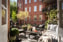 I anslutning till köket där det vackra gamla serveringsskåpet i originalutförande stoltserar, finns ett tidsenligt glasparti med dubbla dörrar och spröjsade bågar. Här öppnar du upp till den halvcirkelformade balkongen som är mysigt inhyst i en hörna mellan de vackra tegelytterväggarna. Ytan är på cirka 13 kvm och omgärdas av tidstroget smidesräcke. Hörnplaceringen i sydväst bidrar till ett varmare klimat och naturligt skydd från blåst samt gott om sol från lunchtid och några timmar framåt. Här kan du enkelt placera en gasolgrill, krukor och ett middagsbord eller en skön soffgrupp. Innergården framför bjuder på en härlig fridfullhet som gör att du glömmer att du befinner dig mitt inne i stan.
