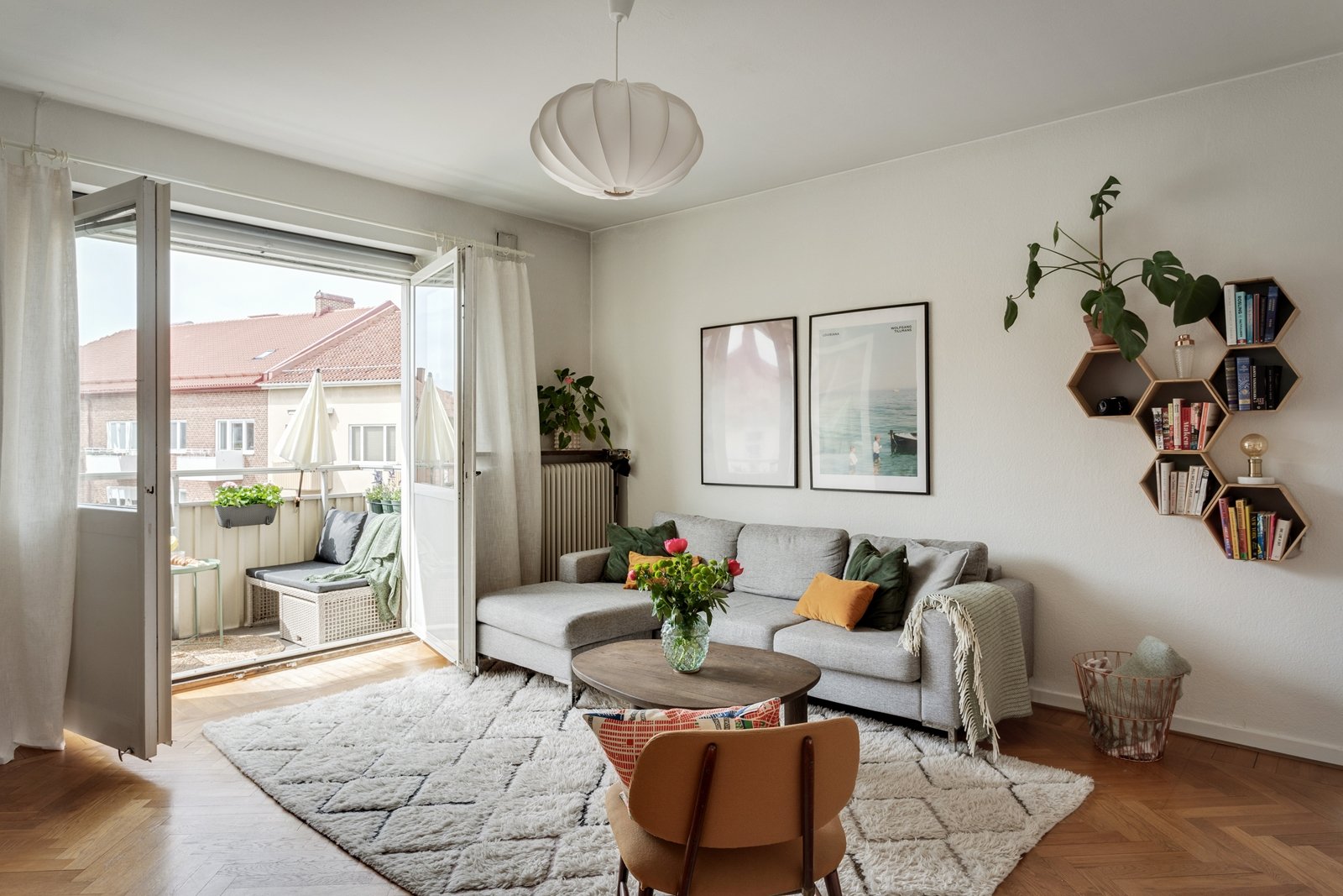 Vardagsrum: På golvet ligger fiskbensparkett, väggarna är målade i vitt. Utgång till balkong i västerläge (eftermiddags- och kvällssol).