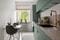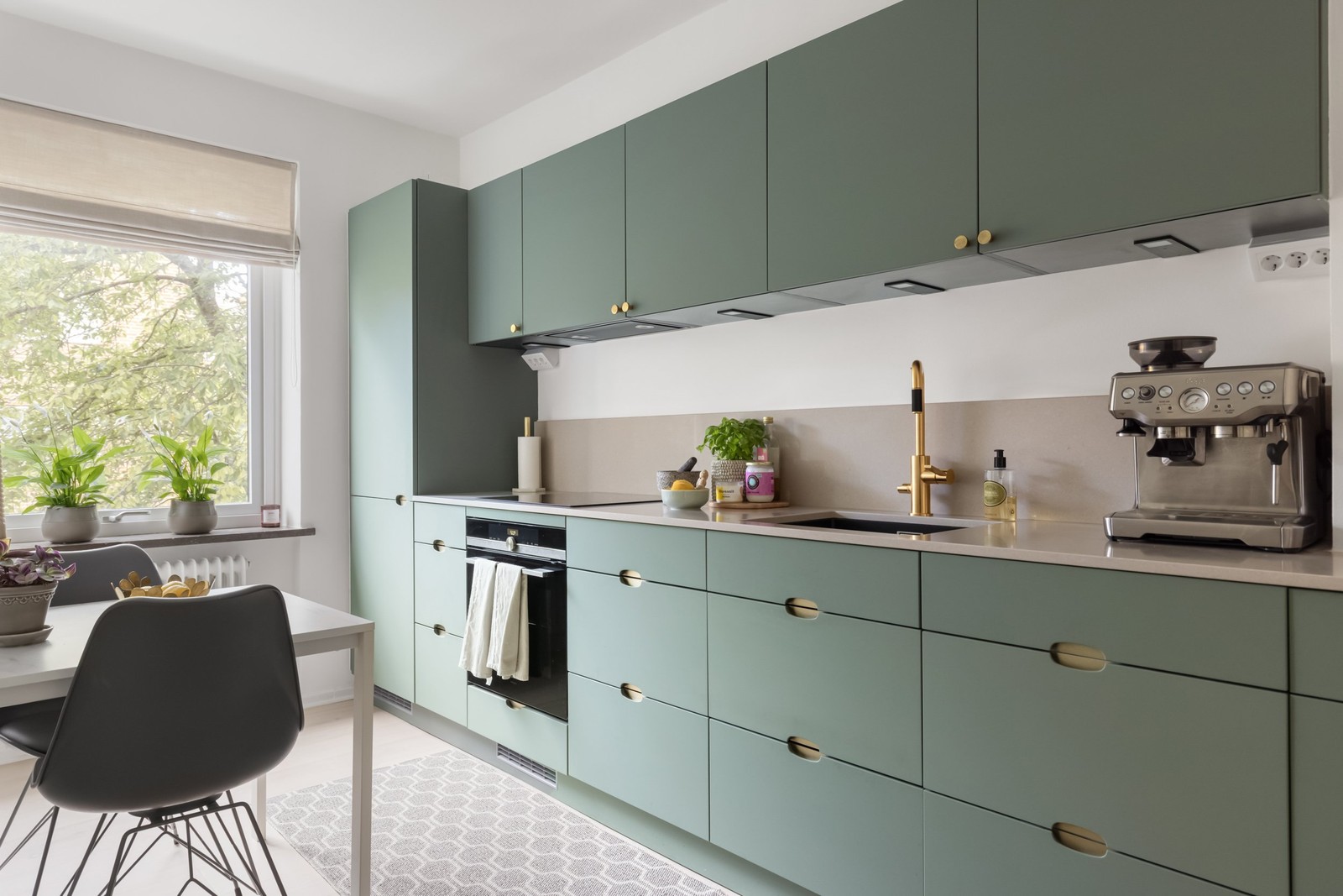 Det smakfullt renoverade köket går i en modern grön nyans som kombineras med lyxiga detaljer i guld och svart – en elegant färgpalett som ger både karaktär och värme. Den exklusiva bänkskivan i sten förhöjer helhetsintrycket och ger en känsla av kvalitet och tidlöshet. Här finns dessutom plats för ett frukostbord för 2–3 personer, perfekt för morgonkaffet eller en avslappnad middag i goda vänners lag.