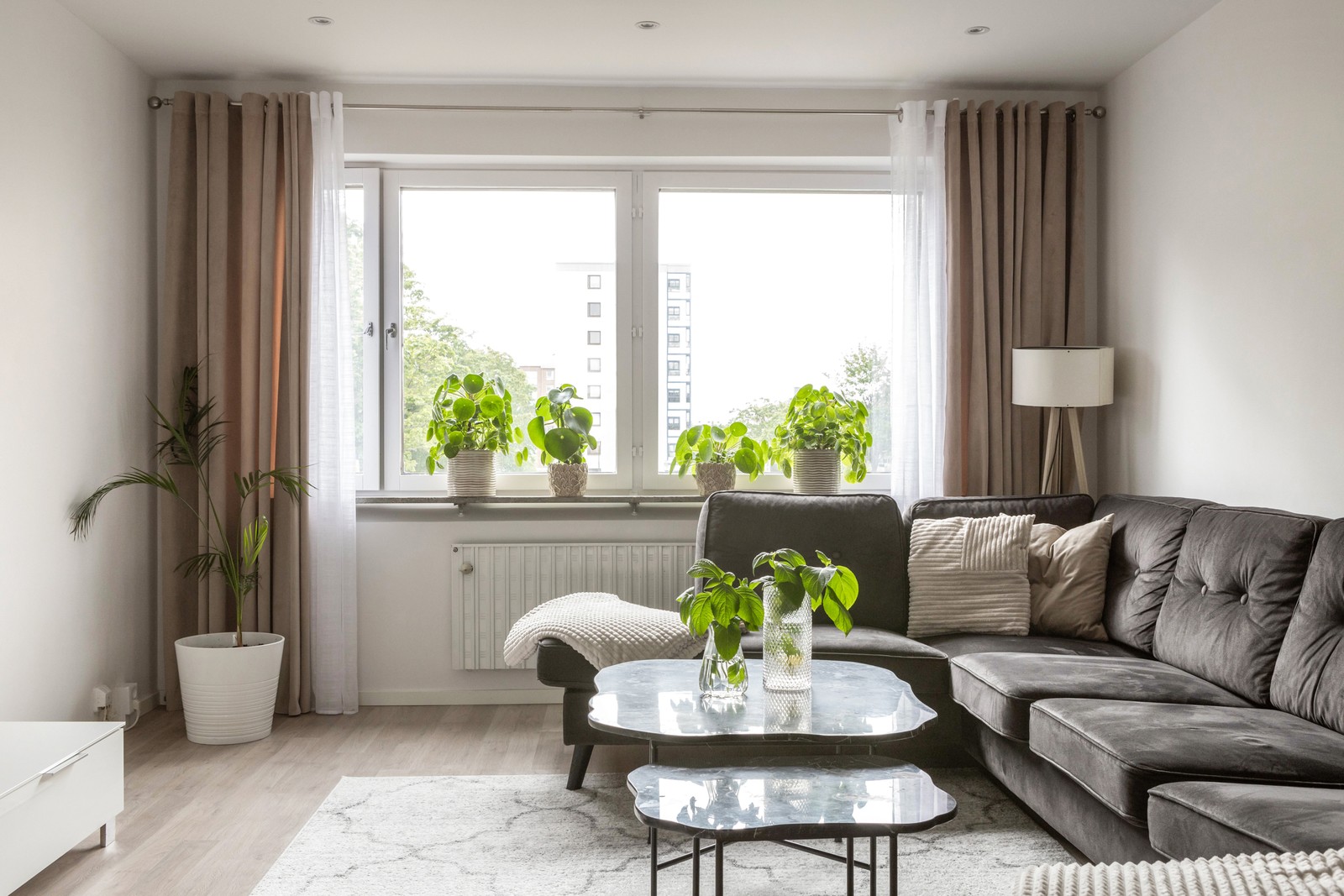 Rymligt vardagsrum med ett härligt ljusinsläpp. laminat på golvet och bredspacklade väggar. Från vardagsrummet når du en stor inglasad balkong i bästa söderläge. Detta blir som ett extrarum och är underbart på vår och sommar.