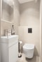 Hel kaklad gästtoalett med inbyggd toalett, kommod och spegelskåp.