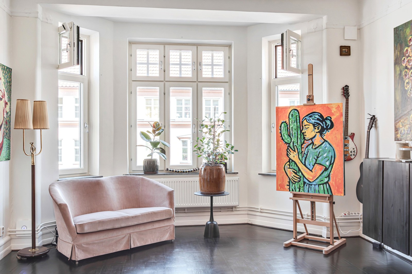 Från hallen möts man av det trevliga sällskapsrummet, som idag används som studio och kontor. Generös takhöjd, originalparkett, ljusa väggar samt stuckaturer skapar både rymd och pampighet. Rummet stoltserar med ett vackert burspråk, vilket ger ett stort ljusflöde och trevlig utsikt. Ett rum med många möjligheter!
