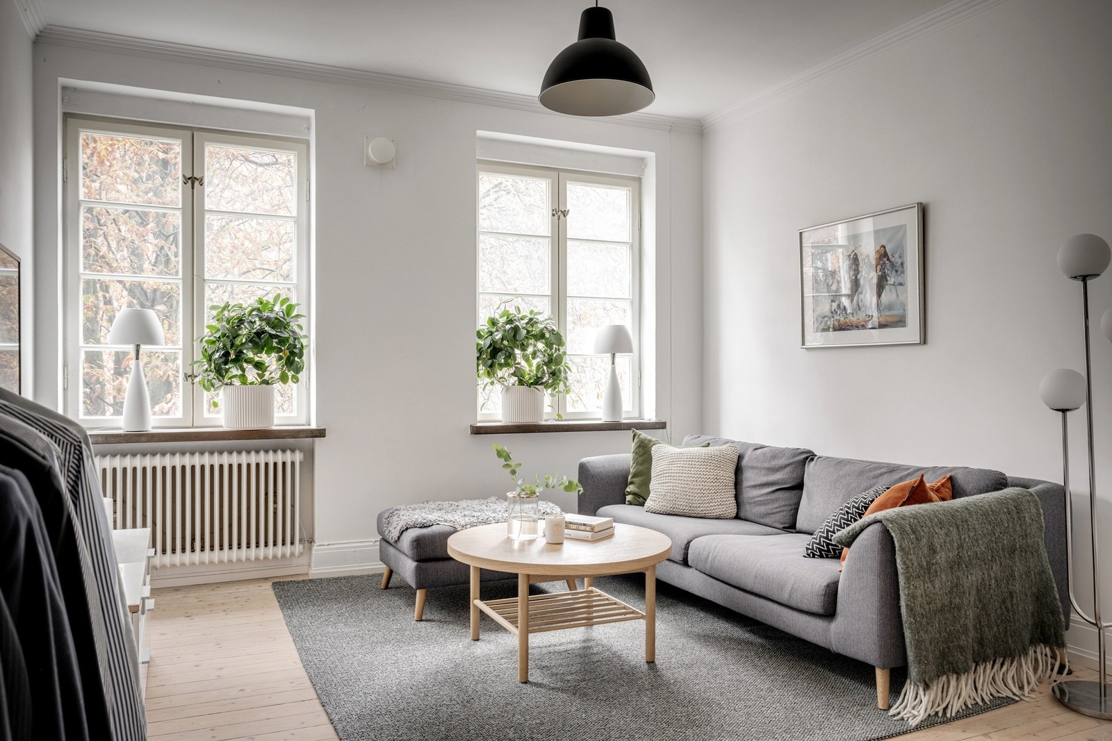 Stort vardagsrum med vackra detaljer från byggåret som stora spröjsade fönster mot lummig innergård, brädgolv och takrosett. Här finns plats för soffgrupp, TV-hörna och förvaring. Den smarta sovalkoven intill rymmer plats för dubbelsäng och får en naturlig avskildhet.