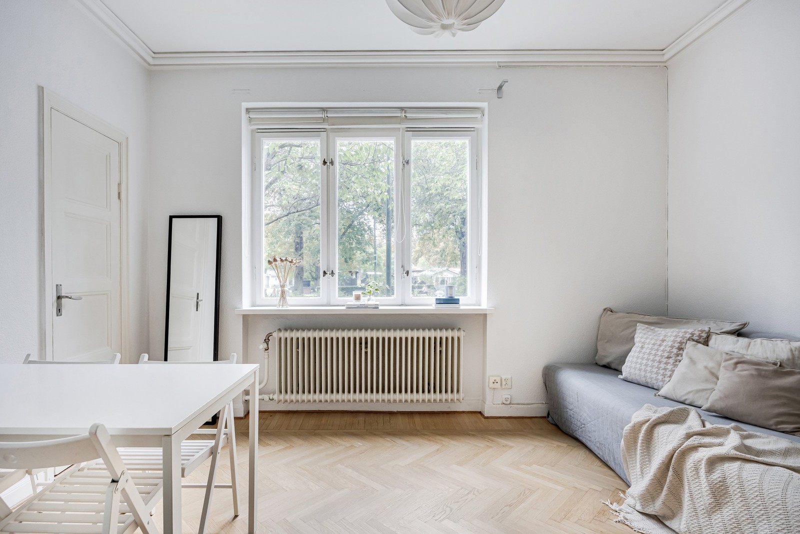 Vidare in i bostaden finner du det härliga rummet som bjuder på fint ljusinsläpp från ett stort fönsterparti som vetter mot S:t Pauli Mellersta kyrkogård. Här finns gott om plats att möblera med soffa och diverse förvaringsmöbler. I en avskild del av rummet finns en praktisk alkov som utgör bostadens naturliga sovplats. Från rummet nås en klädkammare. Takhöjden är väl tilltagen och på golvet vilar en vacker fiskbensparkett i sann 30-talsanda. Väggarna är målade i vitt.