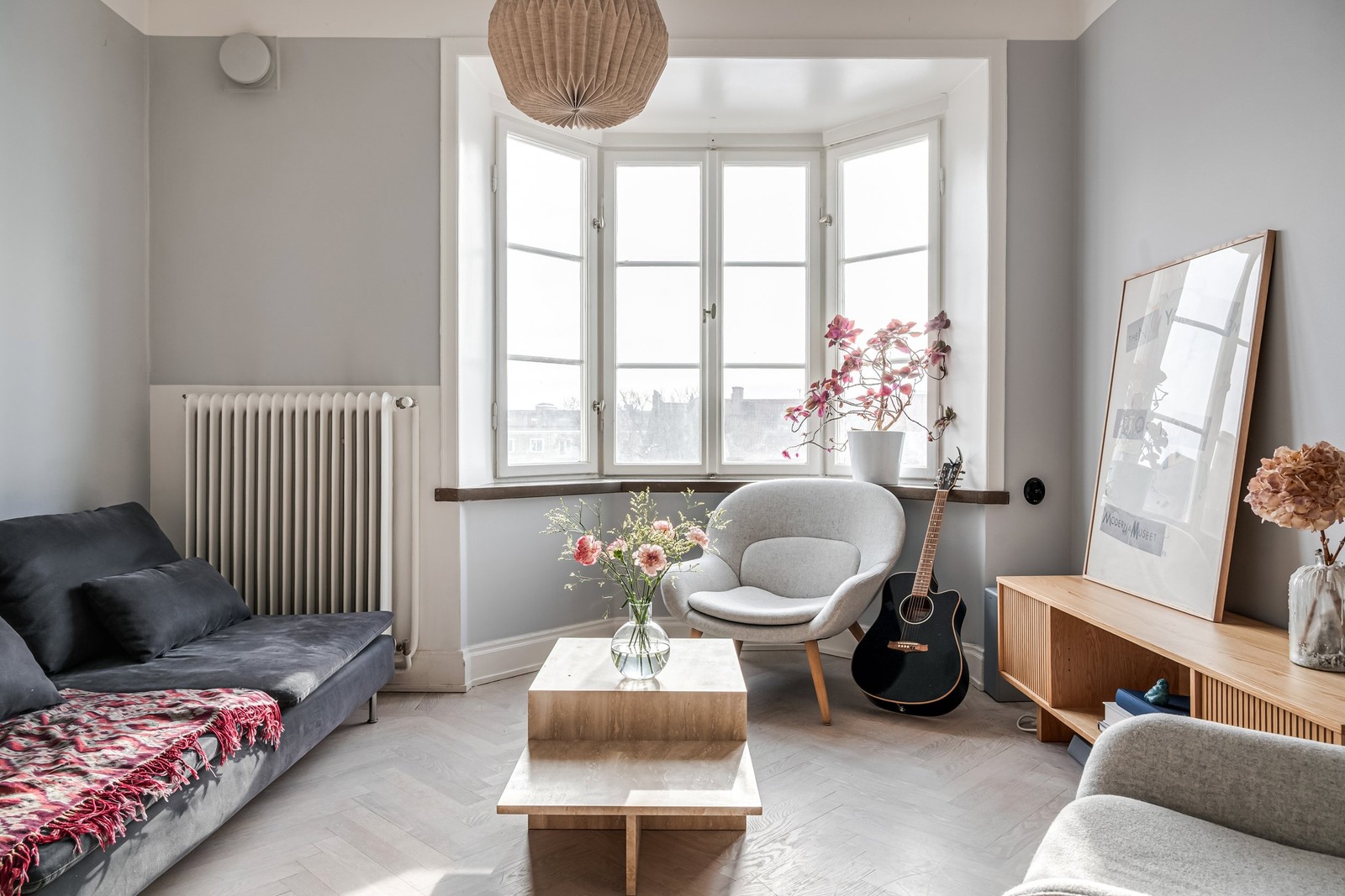 Ljust och rymligt vardagsrum med fiskbensparkett.