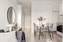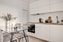 Kök och vardagsrumsdelen är en kombinerad yta där det finns plats för matbord och mindre soffa. Parkettgolv och vita väggar.