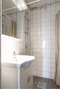 Stilrent och helkaklat badrum i klassisk design. Golvet pryds av ljusgrå klinker och väggarna av vita kakelplattor. Här finns dusch, WC, handfat med kommod samt ett väggfast spegelskåp – allt smakfullt sammansatt för en tidlös känsla.
