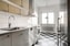 Direkt till vänster nås det smakfullt renoverade köket med en trivsam matplats vid fönstret. Här möts originaldetaljer och modern funktion i en harmonisk kombination – bevarade överskåp i original samsas med nya underskåp i en ljusgrå ton. Bänkskivor i klassiska Perstorp Virrvarr och rostfria vitvaror ger ett stilrent och tidlöst intryck. Golvet pryds av en svart- och vitmönstrad plastmatta som förstärker kökets karaktär.