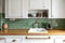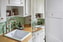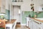 Kök - Direkt in till vänster från hallen sett ligger köket i charmig originalstil med plats för matbord. Vacker utsikt mot innergården och gott om förvaring. Här samsas skåpsluckor i vitt med vackert grönt kakel från Byggfabriken med bänkskiva i trä. Maskinell utrustning enligt följande: kyl/frys, spis/ugn, diskmaskin och fläkt.