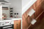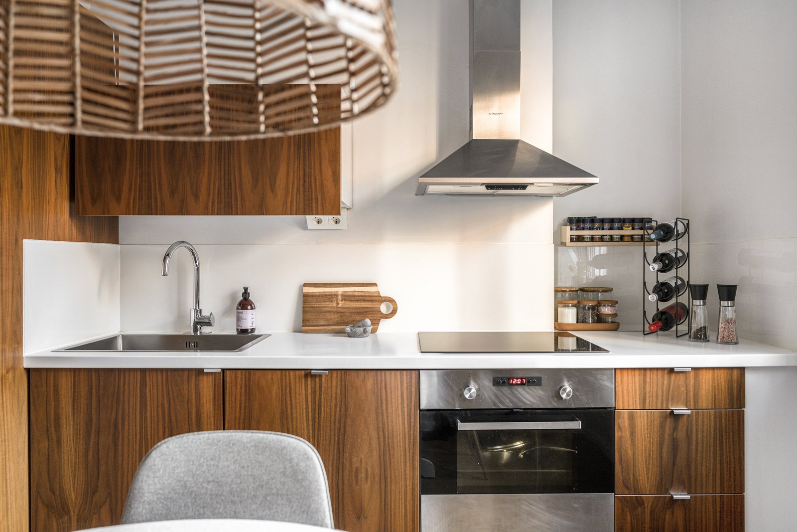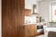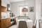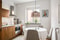 Till vänster om hallen öppnar det smakfullt utformade köket upp sig, en stilren och genomtänkt miljö med trendiga luckor från Picky Living, vit bänkskiva och ett sobert stänkskydd i ljus kulör som tillsammans skapar ett harmoniskt och tidlöst uttryck. Här samsas generösa arbetsytor med goda förvaringsmöjligheter och en naturlig plats för matbord, vilket gör köket till en trivsam samlingspunkt i hemmet.