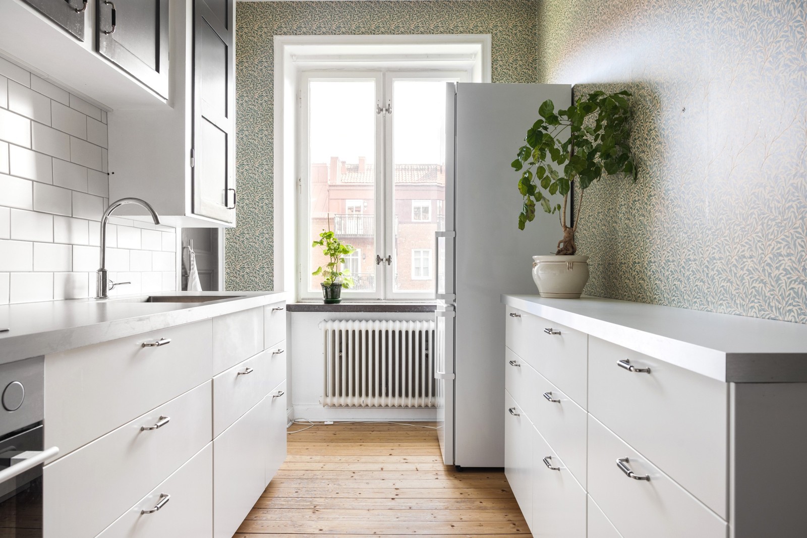 Köket är ett stilfullt möte mellan nytt och gammalt, totalrenoverat 2018 med genomtänkt design från IKEA. De vita underluckorna kombineras med bevarade grå originalluckor på överskåpen, vilket skapar en charmig kontrast. Laminatbänkskivan kompletteras av vitt kakel som stänkskydd, vilket ger en fräsch och lättskött yta. Plankgolv och vackra tapetväggar sätter en varm och inbjudande ton. Köket är fullt utrustat med kyl/frys, varmluftsugn, induktionshäll och mekanisk fläkt.