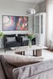 Rummet ger plats för både soffgruppen och matbord. Utgång till balkongen.