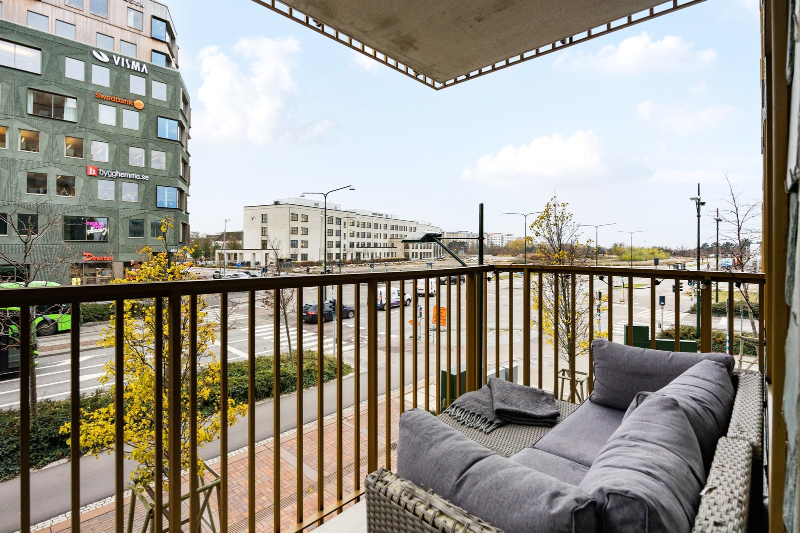 Vidsträckt balkong med många soltimmar och utrymme för soffa eller matplats för ett par och några till. Härifrån blickar du vitt och brett över Neptunigatan – i riktning mot Malmö Live och centrum i öst och Ribersborg i väst.