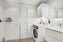 Fräsch och stilrent badrum med vitt väggkakel och grått klinkergolv. Badrummet är inrett med duschalkov, wc, tvättställskommod och en kombimaskin för tvätt och tork med förvaringsskåp ovan.