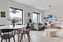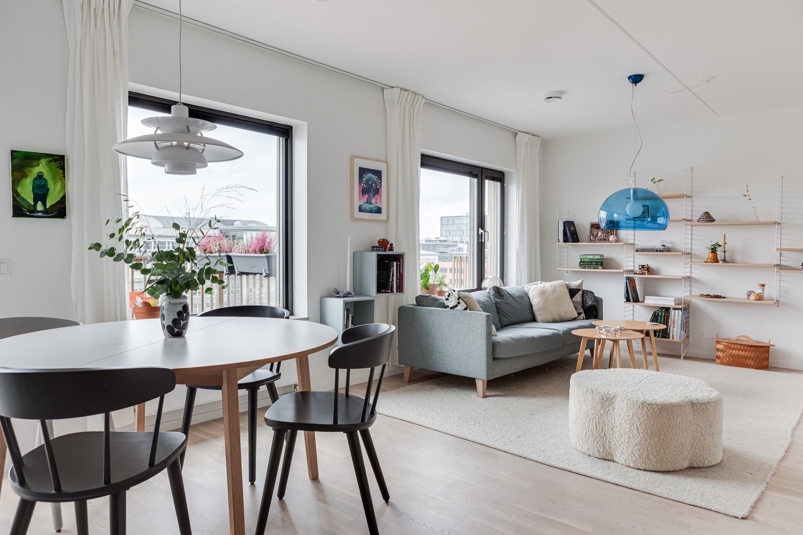 Vidare in i lägenheten öppnar hemmets sällskapsavdelning upp sig där kök och vardagsrum förenas i en social, öppen planlösning. Här finns det gott om plats för soffgrupp och matplats. Stora fönsterpartier skapar ett vackert ljusinsläpp till sällskapsavdelningen.