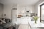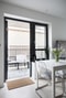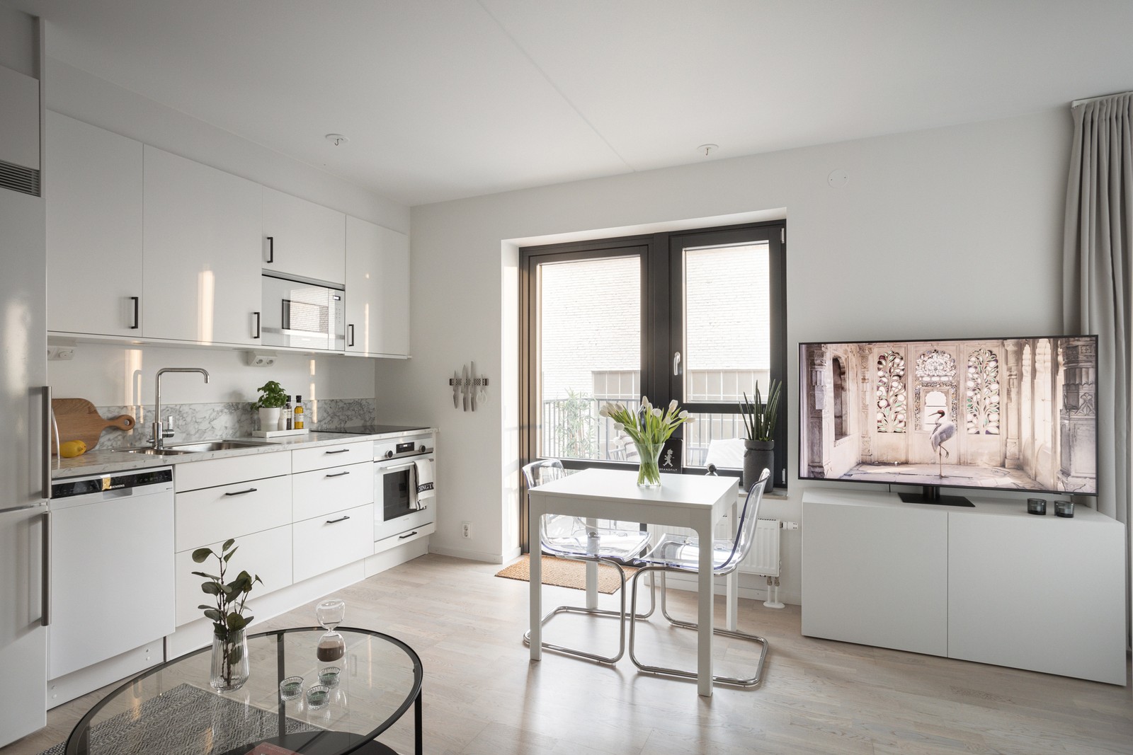 Golvet är av ekparkett och möter släta vita väggar med en rå betongvägg som fondvägg. Här finns plats för soffa och litet matbord.
