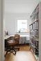 Ljust sovrum till vänster om sällskapsdelen. Även här återkommer ekparketten och väggarna är vita. Förvaring i garderob