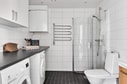 Snyggt helkaklat badrum med dusch, WC, handfat med kommod och spegel. Här finns även en kombinerad tvättmaskin/torktumlare med en praktisk bänkskiva och väggskåp ovanför för extra förvaring.